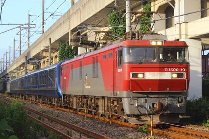 今年7月に手稲へ輸送され、北海道内で運行されていた「THE ROYAL EXPRESS」(2・3・7号車欠車)とマニ50 2186が道内での運行を終え、手稲→伊東(伊豆高原)間で甲種輸送されました。青森(信)→新鶴見(信)間の牽引はEH500-19。