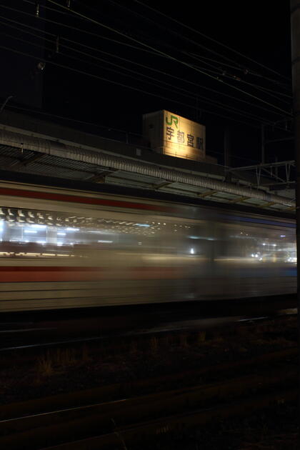 宇都宮線内は夜間通過ながら宇都宮11番線停車があり、しかし入線とほぼ同時に10番線へ列車が入ってしまうため宇都宮駅外から。寄りのアングルだと前照灯が眩しすぎたので、編成は入りきりませんがサイド寄りで。